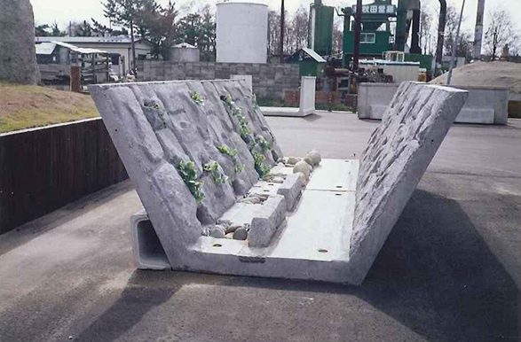 - ホタルの棲息を目的とし幼虫から成虫までの成長に適した環境をつくります。ホタルの幼虫が登れる多孔質な面を有し勾配を70°前後としてあります。
