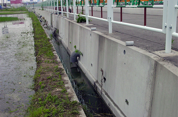 - 路面排水溝と隣接する高低差のある敷地の簡易土留めを兼ね施工が省力化でき経済的です。