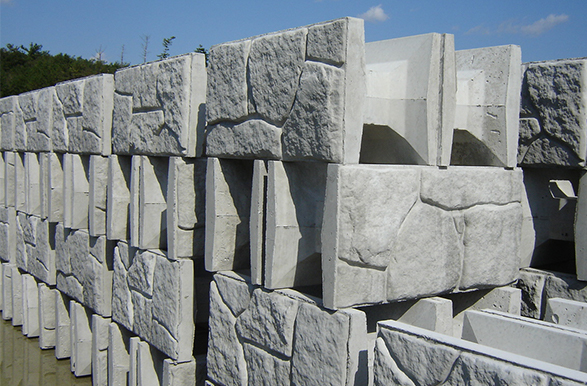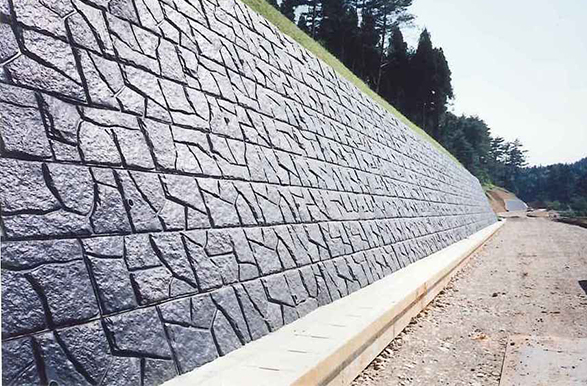 大型積みブロックの前面に擬石化粧を施し景観に優れます。大型積み製品のため、工期短縮でき施工経済性に優れます。